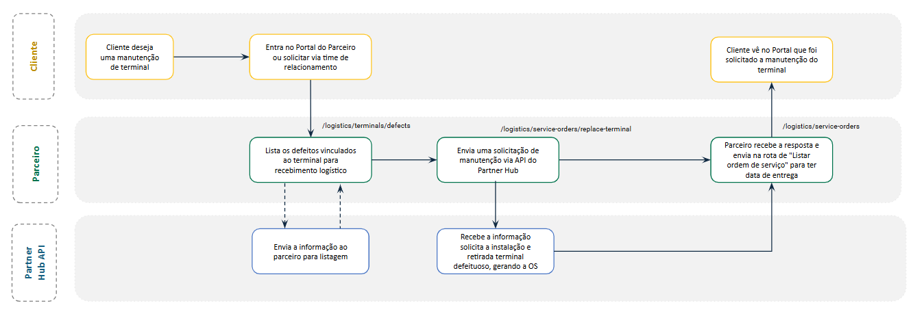 Troca de Terminal: O parceiro solicita a manutenção do terminal, especificando o defeito ou motivo para a solicitação.