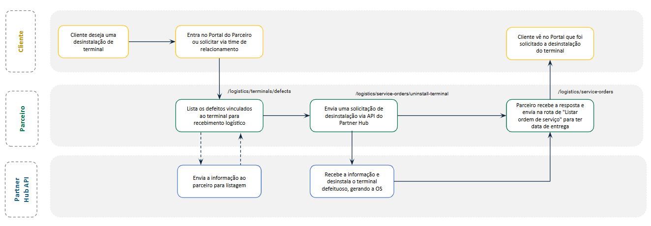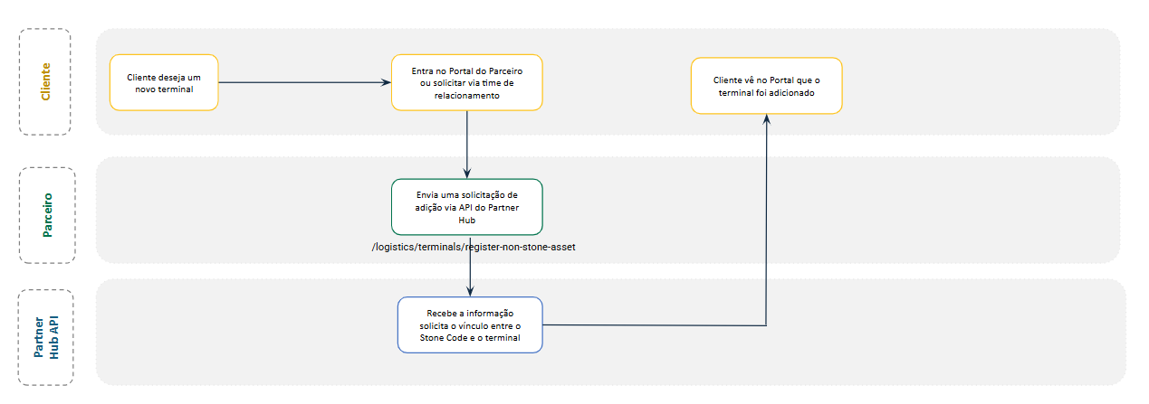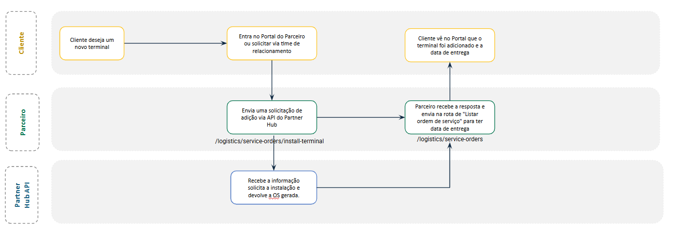 Instalação do Terminal: Através da API, o parceiro solicita um ou mais terminais para o cliente, especificando o modelo desejado.